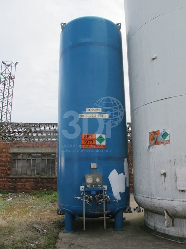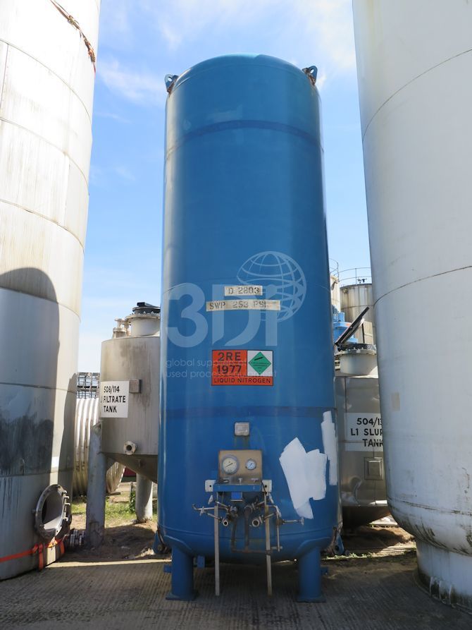 Used 13,420 Litre Liquid Nitrogen Storage Tank, manufactured by Cryoplants Ltd, 1972. Model: VIE134/501. Orientation: vertical, cylindrical, dished top and bottom on legs. Working pressure 17.4bar. Working temperature -196degC. Dimensions: 2300mm diameter, 7500mm overall height. Previously used to store liquid nitrogen. Complete with documentation (lifting inspection cert, letter of providence, vacuum test cert, manufacturers dossier and test history). Empty weight 9900kg.