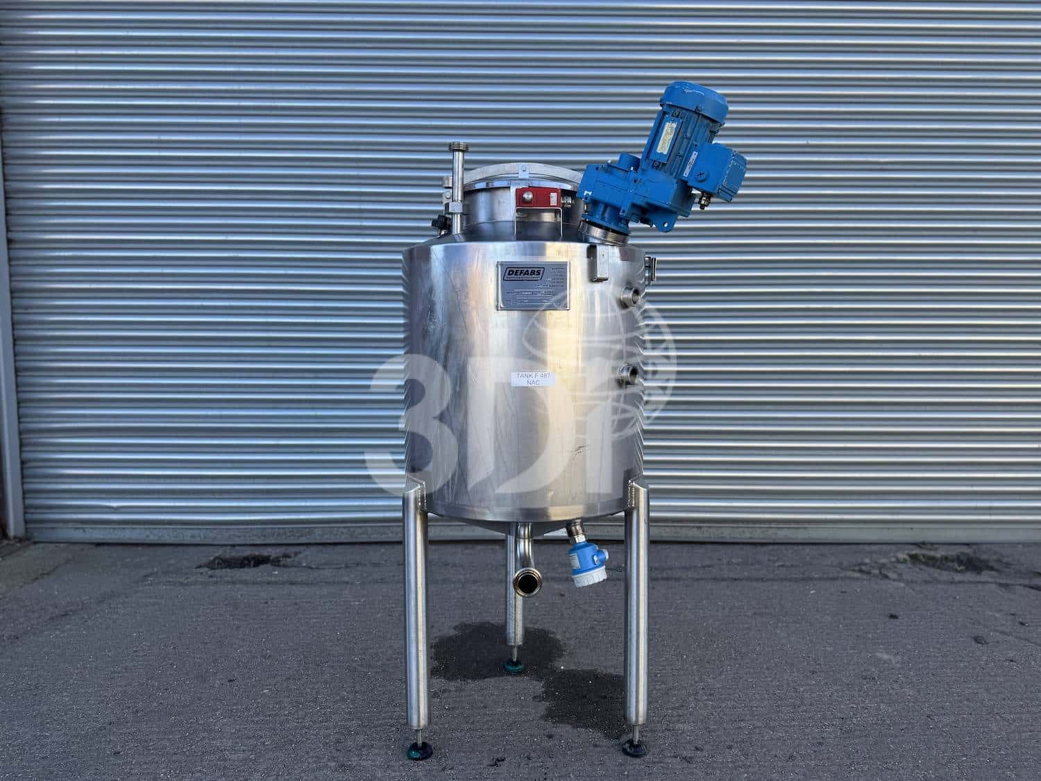 Used 180 Litre Stainless Steel Mixing Tank, built by Defabs, 2009. Orientation: Vertical, cylindrical, dished top and bottom. The tank is supported on 3 legs. Dimensions: 600mm diameter, 600mm tan to tan, 100mm dished base, 50mm dished top, 1550mm overall height. Connections: 1 x 300mm top manway, 1 x 50mm top inlet, 1 x 40mm top inlet, 1 x 25mm top inlet, 1 x 50mm bottom outlet. Fitted with a Transkem 4 blade turbine agitator powered by a 0.25kw Siemens electric motor. This 180 litre stainless steel mixing tank was previously used in the food industry.