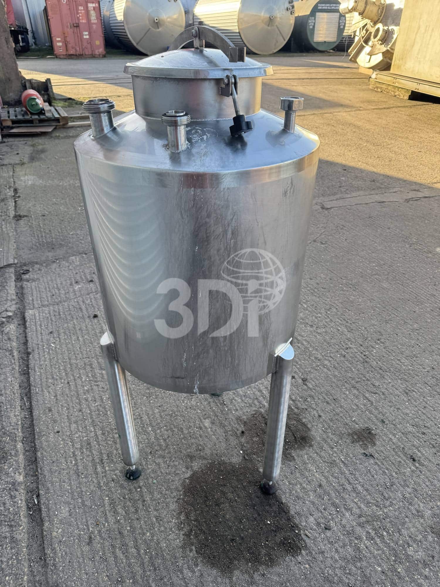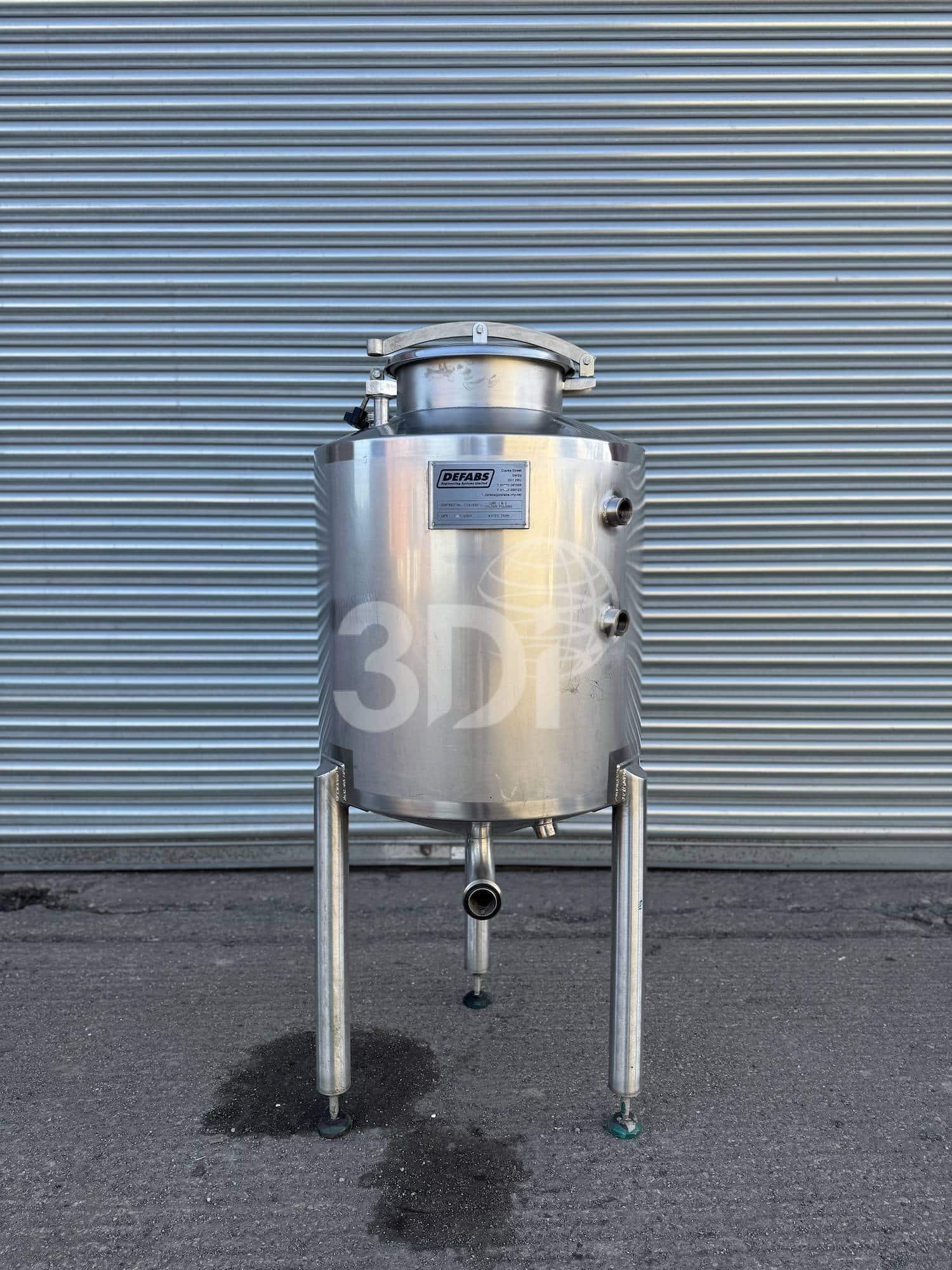 Used 180 Litre Stainless Steel Storage Tank, manufactured by Defabs, 2009. Orientation of the tank is vertical, cylindrical, dished top. It is supported on 3 stainless steel legs. Dimensions: 600mm diameter, 600mm tan to tan, 100mm dished base, 50mm dished top. Connections: 1 x 300mm top manway, 1 x 50mm top inlet, 1 x 40mm top inlet, 1 x 25mm top inlet, 1 x 50mm bottom outlet. This 180 litre stainless steel storage tank was previously used in the food industry. This tank is ideal for businesses requiring food-grade storage solutions, including processing, mixing, or holding liquids and semi-liquids.