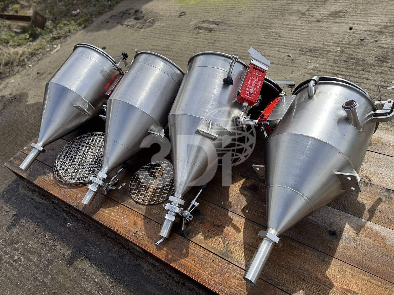 Used 50 litre Stainless Steel Vessel. Material of construction stainless steel. Orientation vertical, cylindrical, flat top, coned base. Support with side supports. Dimensions 395mm internal diameter, 340mm on the straight, 870mm overall height. Connections 1 x 50mm bottom outlet with valve, 1 x 40mm side connection. Previously used in the food and beverage industry.