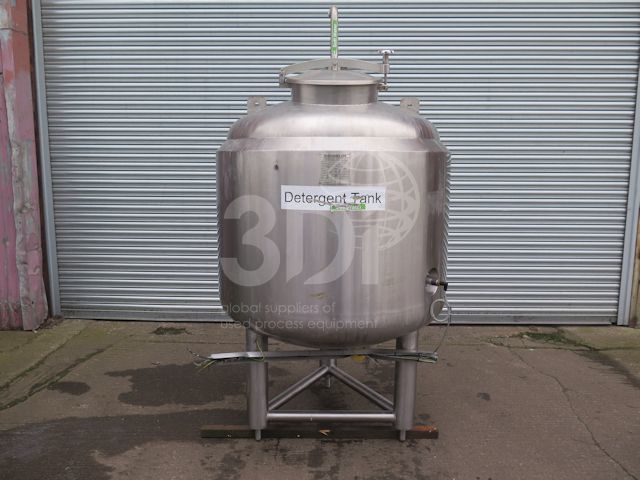 Used 700 Litre 316L Stainless Steel Storage Tank, manufactured by Suncombe Ltd, 2005. Orientation: vertical, cylindrical, dished top and bottom, supported by (3) legs. Dimensions: 1200mm diameter, 900mm on the straight, 2000mm overall height. Working pressure atmospheric, design temp 0 to 90degC. Vessel is insulated in stainless steel. Previously used on detergent.