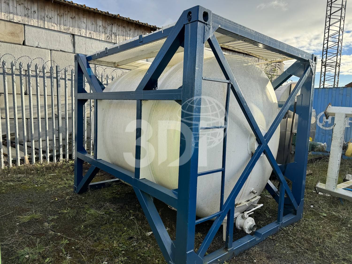 Used 9,000 Litre ISO Tank Container. Material of construction stainless steel tank with steel support frame. Tank dimensions 2125mm diameter, 2000mm tan to tan, 400mm dished ends. Support frame dimensions 2420mm wide, 2420mm high, 3030mm length. Tank connections 2 x 80mm top inlet, 1 x 450mm top man way, 80mm side bottom outlet fitted with manual ball valve. Previously used to store water.