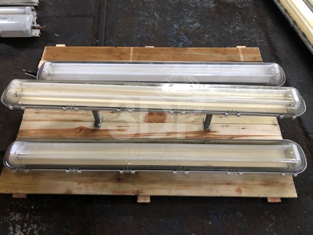Used Appleton ATX Fluorescent Luminaire FEB258BUSAE, manufactured by Appleton ATX, FE Series heavy duty non metallic, 2 x 58 watt, 110 to 254 Vac/Vdc, 50/60hz, surface/suspension mount standard wiring, cable type armored M20, ATEX certification type FLe, LCIE 07 ATEX 6017, Ex de IICT4 – Ex ID A21 IP66/67, T: 75degC. Corrosion-resistant fiberglass reinforced polyester (FRP) housing with polycarbonate lens. Can be installed in hazardous areas designated as Zone 1 and 2. For indoor/outdoor use. Can be horizontally or vertically mounted.