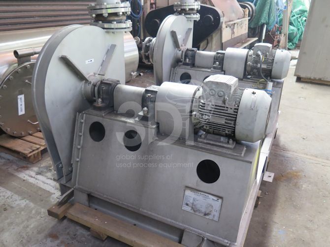 Used Howden Buffalo Pressure Blower HD42WE, manufactured by Howden Buffalo, 2000, Type HD42E Blower, Serial no. C-1375-A02, material of construction stainless steel, volume: 2.2lbs/hr, press PA: 10000 SWG, Fan speed 2900rpm. Complete with a 5.5kw Siemens electric motor. Weight 475kg.
