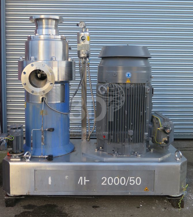 Used Disperser Mixer, manufactured by IKA Werke Gmbh & Co Kg, 2012, Type MHD2000/50-ATEX. Material of construction: 316L (1.4404) and 316Ti (1.4571) stainless steel housing and all contact parts. Max capacity: 40,000 litres/hr. Dimensions: 1691mm height, 1725mm length, 800mm width. Connections: 8″ powder inlet, 4″ liquid inlet, 6″ outlet. Complete with double mechanical seal and 75kw ABB electric motor with V-belt drive (400/690v, 3ph, 50hz, 1500rpm), Explosion proof EEx de IIC T4. Weight: 2500kg. Previously used on detergents.