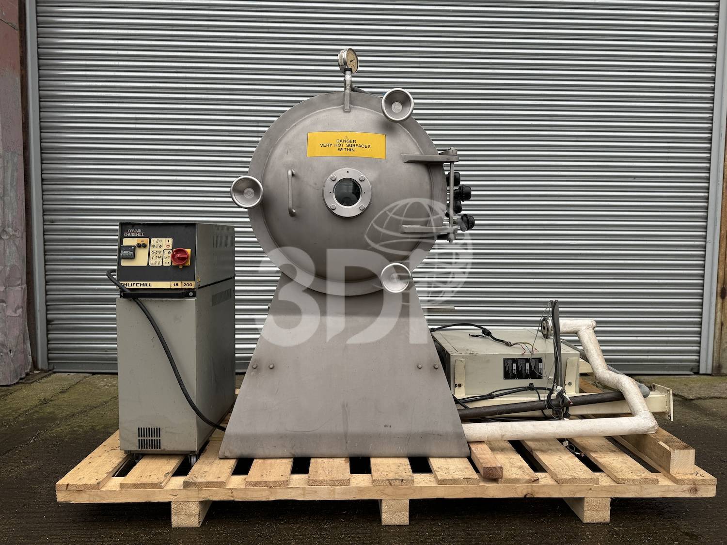 Used Mitchell Vacuum Shelf Dryer, manufactured by Mitchell Dryers Ltd. Material of construction 316 Stainless Steel. Design code BS5500:CAT3, design pressure main body 0.0344 N/mm2 (5 psig) and 0.01 N/mm2 (full vacuum), thermoplate 0.344 N/mm2 (50 psig), design temperature 200degC. The unit is a standard 676mm diameter dryer with 630mm inside straight length between flanges and dished ends, which takes the form of doors, hinged with hand wheels for securing. A 100mm diameter sight glass is mounted in both rear and front access door, a 75mm bursting disc assembly is mounted on the cylinder diameter. The inside of the vacuum shelf dryer is fitted with a framework bolted to the shell arranged at equal pitches to accommodate 5 stainless steel platens. The platens are suitable for working pressures upton 3.5bar and can accommodate 6 off 457mm x 457mm x 50mm deep drying trays (not included). The vacuum shelf dryer comes with a local control panel, Conair Churchill oil heater and GVE liquid ring vacuum pump. Previously used in the food industry.