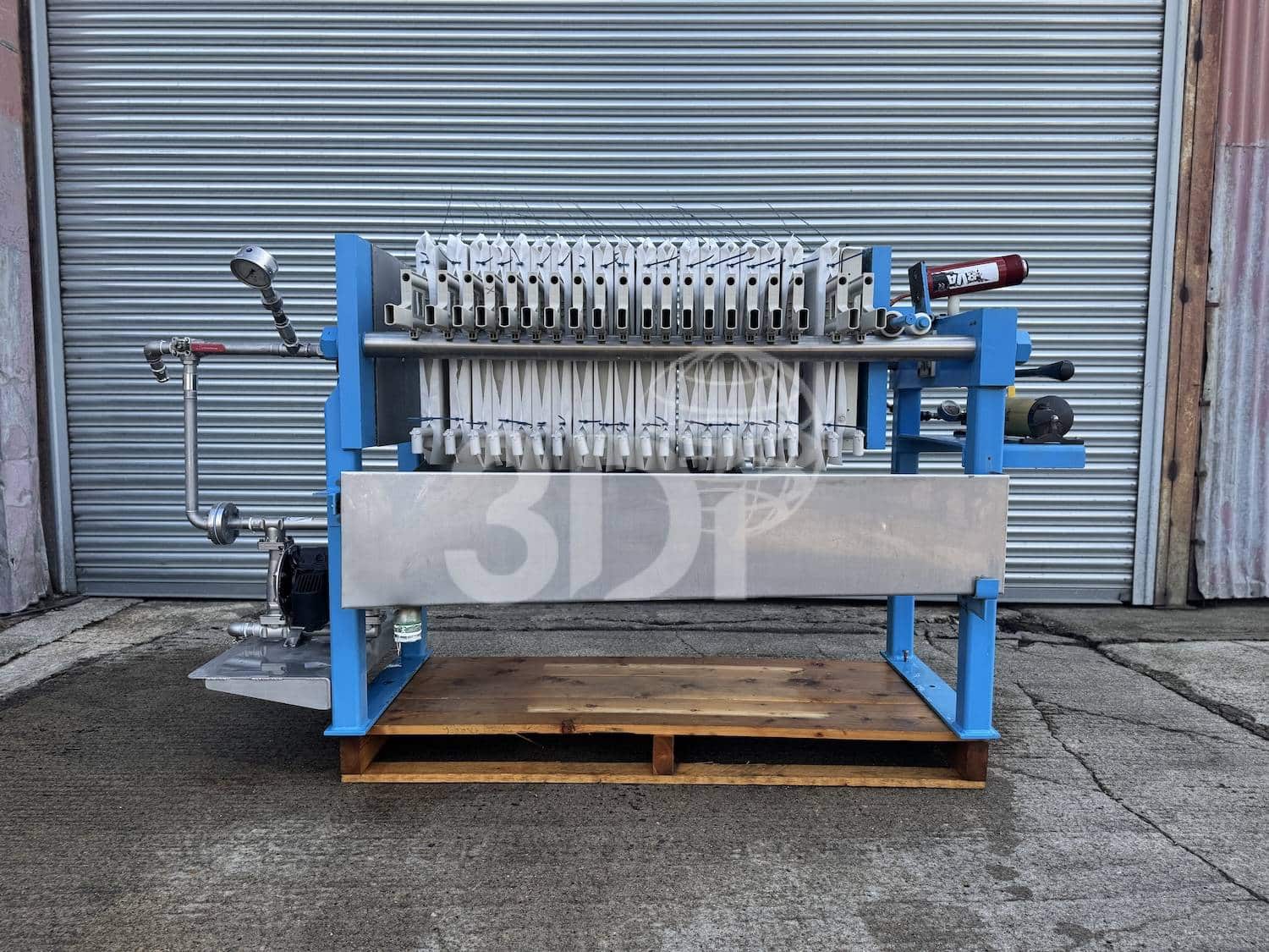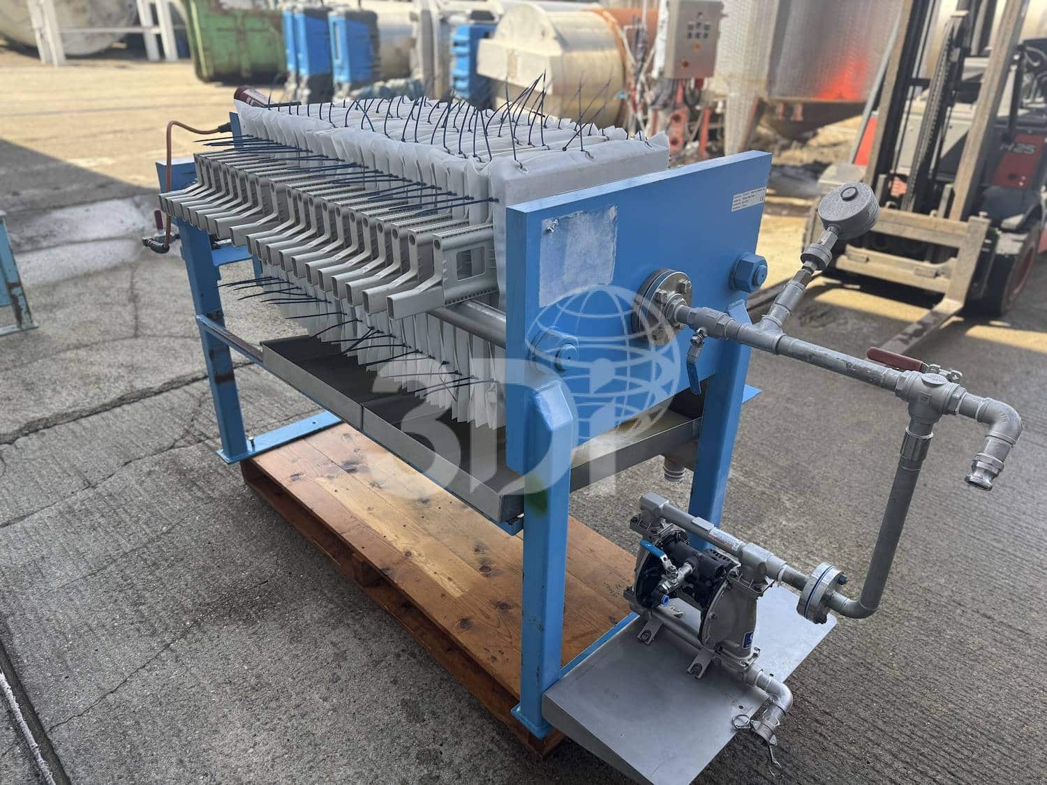Used Prep-Tec Chamber Filter Press, manufactured by Prep-Tec Systems, 2012. Filter surface area 10m2. The filter press is constructed from heavy duty mild steel and has 20 polypropylene filter plates, each plate is 500mm x 500mm on size. Maximum filtration pressure is 7 bar. The filter press is manually operated and comes with a stainless steel drip tray, Graco Husky diaphragm pump, tipping truck and support legs (630mm high). Overall dimensions 2400mm length, 1000mm width, 1250mm height.