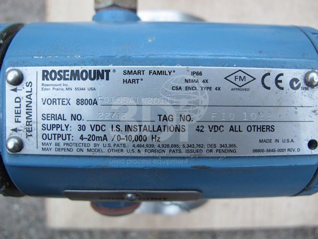 Used Rosemount Vortex Flowmeter, Model 8800A, F015SA1N2DI1, Serial No. 22763, wetted material CF-8M/316L Stainless Steel, 78.343 K-Factor, Max process temperature 232degC,40mm connections.